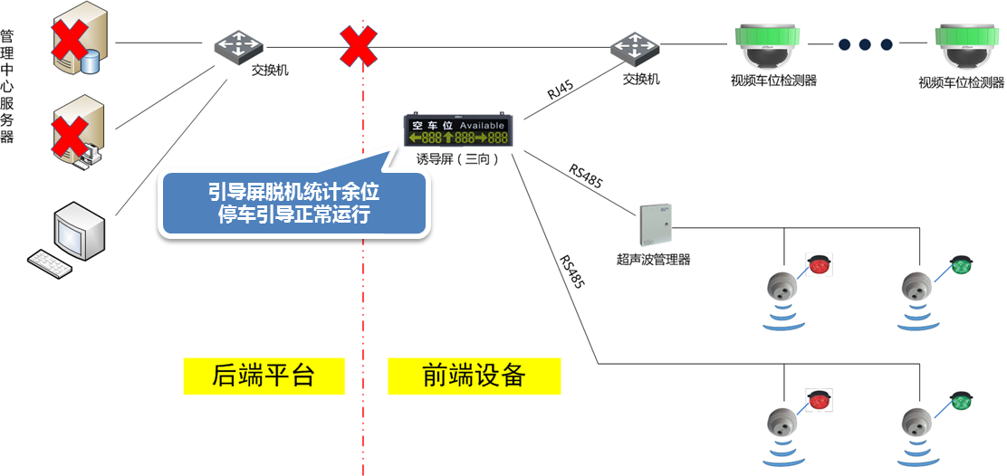 管理服務器故障或網(wǎng)絡異常時,引導屏脫機統(tǒng)計余位,停車引導系統(tǒng)仍可正常運行。