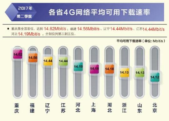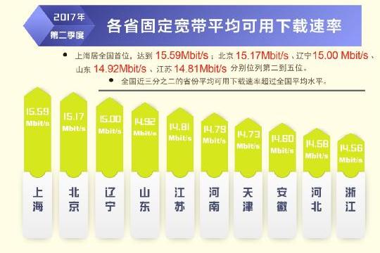 根據(jù)本次報告,除西藏自治區(qū)外,全國其他所有省級行政區(qū)域固定寬帶平均下載速率均超過 12Mbit/s,上海、北京、遼寧率先超過或達到了 15Mbit/s,位列全國前三,山東、江蘇緊隨其后。在直轄市和省會城市固定寬帶下載速率排行榜上,上海、北京、濟南、天津、福州位居前五位。從移動寬帶網(wǎng)速狀況看,重慶、福建、遼寧、江蘇、河北的 4G 網(wǎng)絡用戶下載速率排在全國省級行政區(qū)前五位;不同電信運營企業(yè)中,中國聯(lián)通的 3G 網(wǎng)絡用戶下載速率和 4G 網(wǎng)絡用戶下載速率均最高,分別達到 5.20 Mbit/s 和 15.05 Mbit/s。